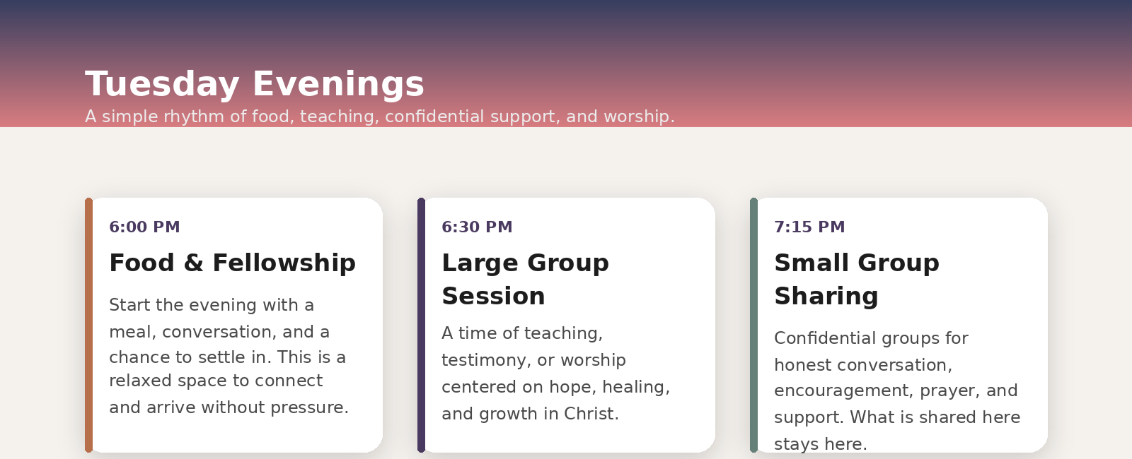 Jesus meets us where we are with honesty, love, mercy, forgiveness, and the invitation to be made new. In that spirit, recovery becomes more than behavior management. It becomes a path toward wholeness in life: spiritually, emotionally, and relationally.