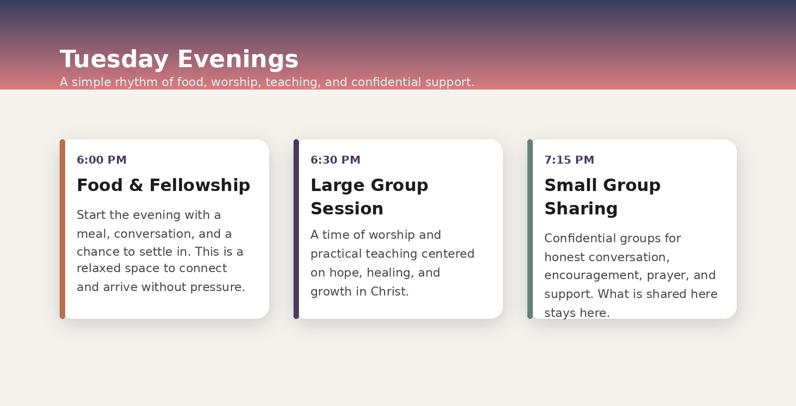 Jesus does not meet people with condemnation. He meets them with honesty, compassion, and the invitation to be made new. In that spirit, recovery becomes more than behavior management. It becomes a path toward wholeness: spiritually, emotionally, and relationally. It is a place to tell the truth, to let go of secrecy, and to begin rebuilding with hope.
